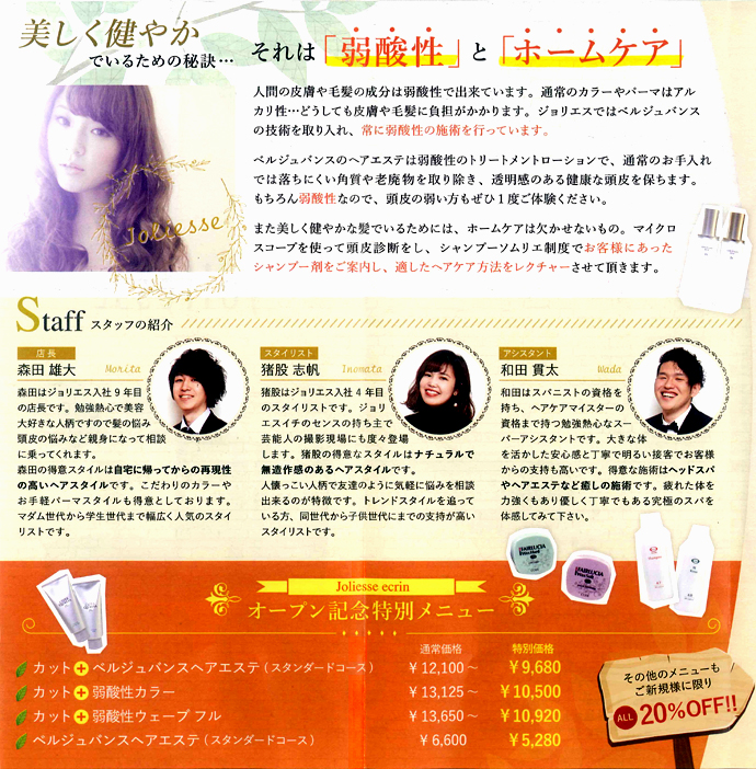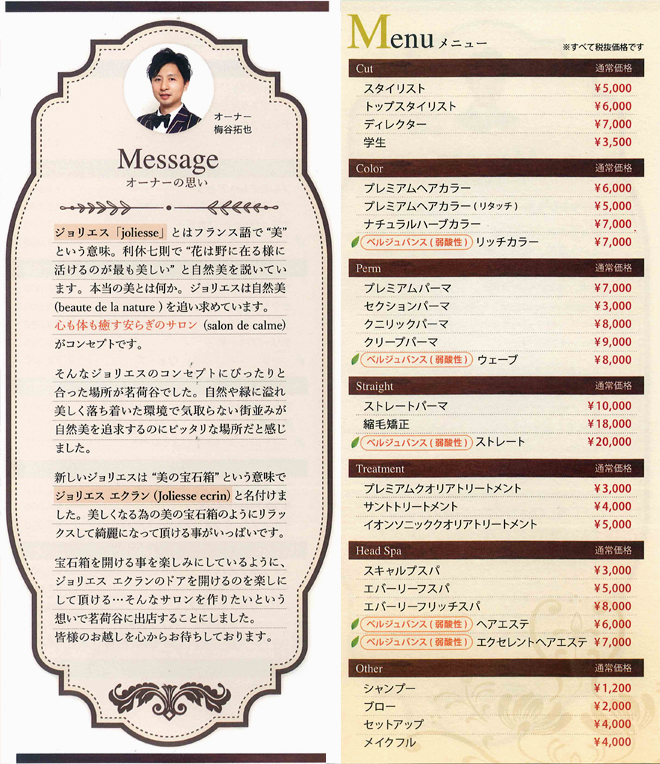 お客様がサロンに足を運ぶ事で、ヘアスタイルだけでなく心から寛ぎ美しくなって欲しい…ジョリエスは、スタッフ一同お客様に心地良さを感じていただけるような温かいサービスを心がけ、皆様のお越しをお待ちしております。 |