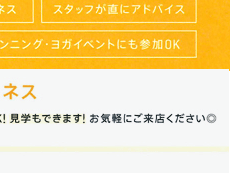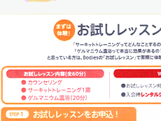 サーキットトレーニング、ゲルマニウム温浴、ランニング、ヨガレッスン等のメニューがございますので、ご自分に合わせて楽しみながらキレイになりましょう。 |