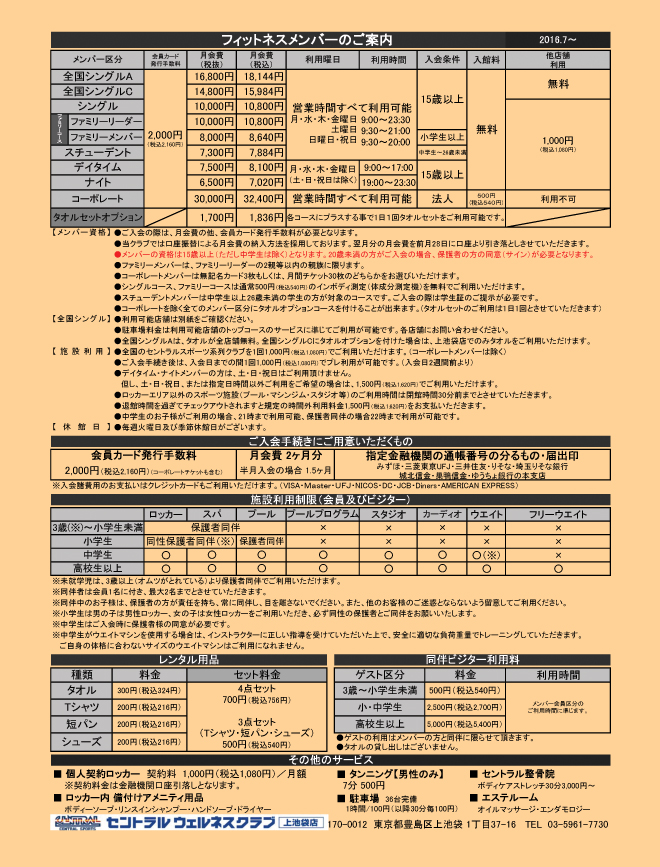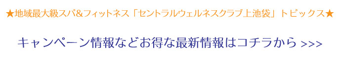 地域最大級のスパ&フィットネス!JR山手線「大塚」、東武東上線「北池袋」両駅からアクセス可能、全国160箇所のスポーツクラブネットワーク「セントラルウェルネスクラブ上池袋」。プール・スタジオ・ジムを利用し、初心者から上級者まで楽しめる豊富な無料プログラムを用意したフィットネス!各種ダンススから文化系カルチャーまで、初めての方でも安心の多彩なカルチャースクール!もちろん大人だけでなく、キッズ向けの各種教室もご用意し、老若男女問わず、皆様のご利用をお待ちしております。設備面は、ジム・スタジオ・プールの他にも、キッズルームや、サウナ&お風呂&ジャグジー、さらにはエステ、マッサージなどのリラクゼーション空間も完備!心身ともにリフレッシュできる空間を提供しています。見学、体験ももちろん大歓迎!まずはお気軽に足をお運びください。 |