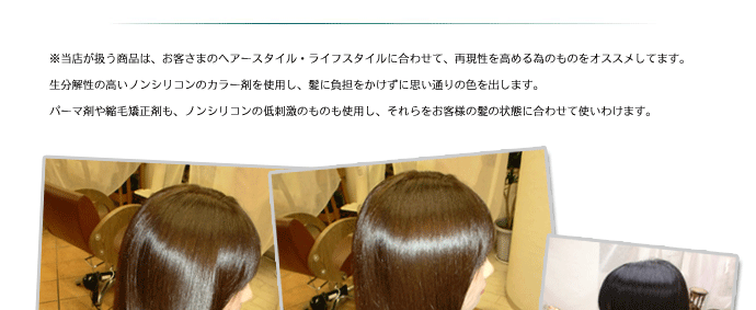 強いクセ毛、毛量の多いクセ毛、ボリュームの出るクセ毛伸ばし、薬剤はお客様の髪の状態に合わせて、ハードタイプのものからソフトタイプ、アルカリ、中性、酸性などを使い分けて施術します。