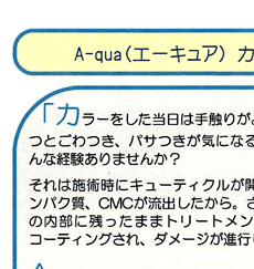他メニュー(カラーの前処理やカラーの後処理、トリートメントカラーの後処理、縮毛矯正の中間処理、パーマの中間処理)などの時にすると、内部補給するので、髪に潤いとしなやかなコシがでます。