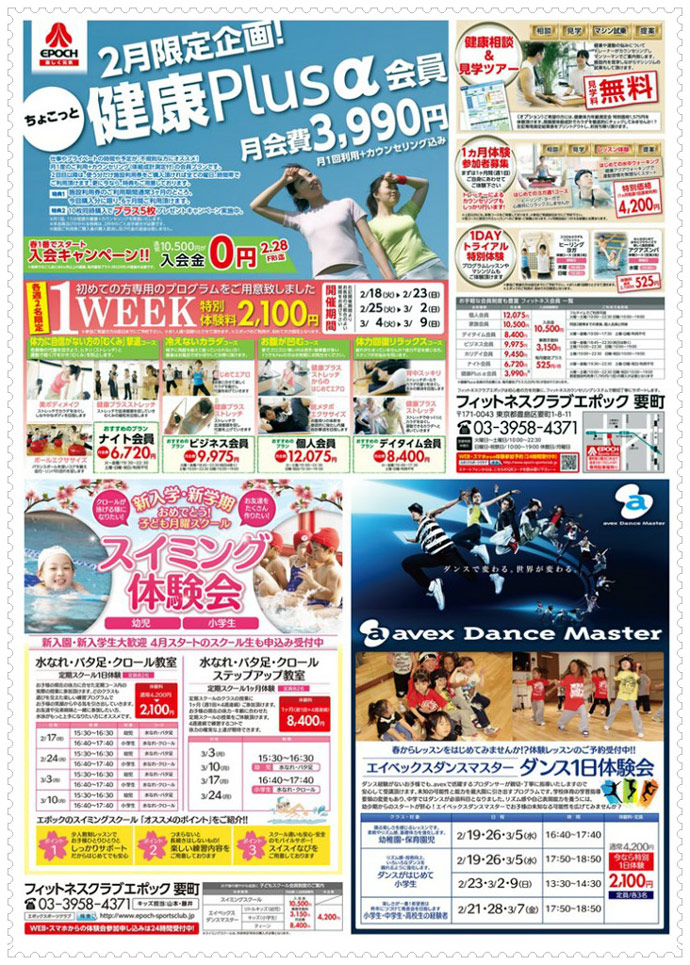 フィットネスクラブエポック要町は、「地域の皆様の健康づくり&憩いの場」をモットーにクラブづくりをしています。地域密着型のスポーツクラブとして、とてもアットホームな笑顔のある、落ち着いたクラブですので、年齢やスポーツ歴などは関係なくどなたでも、ご自分のペースで健康づくりを行うことができます。スタジオではヨガや太極拳・自力整体などのクラスから各種エアロビクス、格闘技レッスン、アクアビクスまでいろいろなクラスがありますので、好みに合わせて参加していただけます。 |