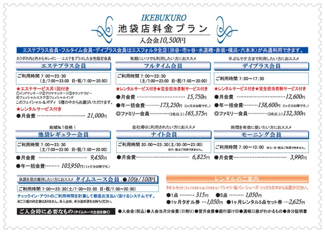 10分100円のタイムユース会員をはじめとする、お手軽にご利用いただけるコースと、スタッフによるサポート・カウンセリングやレンタル用品が毎回無料の、ワンランク上のフィットネスライフをお楽しみいただけるコースをご用意しております。お客様のご利用スタイルに合わせて会員種類をご提案させて頂きますので、お気軽にお問い合わせ下さい! |