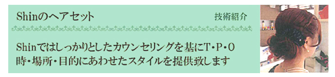 ヘアサロンShinでは、Shin(心)を大切に、お客様のお望みになるスタイルを理解・提案していきます。さらに、リラックスできる癒しサロンとして、ごゆっくりとおくつろぎできる空間を提供しております。夜は9時まで営業しておりますので、日頃の疲れを癒しに、お気軽にお立ち寄りください。スタッフ一同、(心)を込めた接客&技術で、皆様のお越しをお待ちしております。
