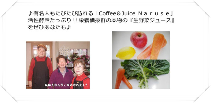 和食の老舗「菜る瀬」が、コーヒーとジュースを楽しめるお店「Coffee&Juice Naruse」をオープンしました。無農薬の有機野菜を搾って淹れる、活性酵素たっぷりの健康的な野菜ジュースは、野菜や果物の本来の力をそのまま搾りだす事により、みなさまのお体の素になる、栄養吸収率抜群の生ジュースとしてお届けしております。当店のジュースマシンは、医療の世界でも活躍しているジューサー!ご家庭でご利用されているジューサーは、高速回転で果物や野菜を砕く為、実は栄養素をかなり潰してしまっています。しかしこのマシンは、毎分90〜96回転という超低速の圧力で押し搾る構造で、野菜本来の旨味を引き出し、酵素や免疫力を作る、栄養価抜群の本物の『生野菜ジュース』になります。安心の素材を使用した酵素が生きたジュースで、皆様の健康をサポート!ゆったりとくつろぎの時間をお過ごし下さい。 |