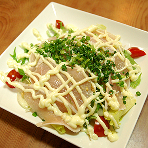 新鮮な鳥ムネ肉を焼き霜にし、新鮮野菜と特製ドレッシングを合わせた、サラダ感覚の低カロリー・高タンパクな健康メニューです。