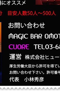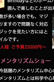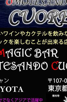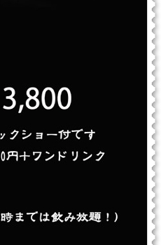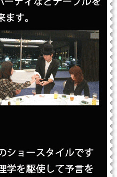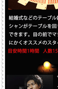 当店のマジックショーは、DAIGOでお馴染みの流行のメンタリズムを取り入れる事により、お客様参加型のショーとなっております。御来店をいただければ、おなたもその日からマジシャンです!