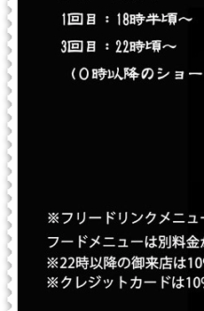 4回目:0時頃〜(0時以降のショーは完全予約制となります。当日23時まで受付)