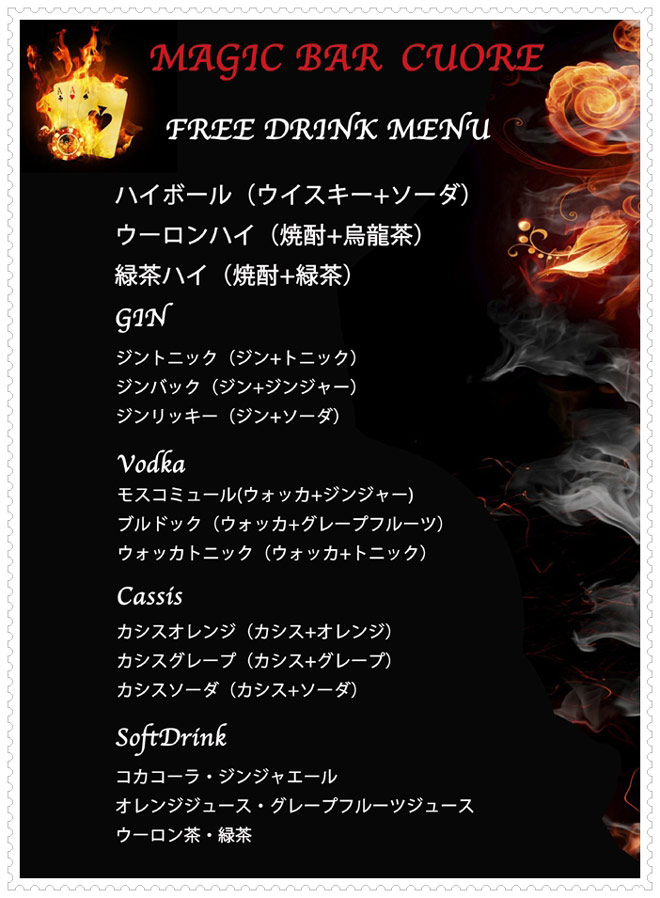下記飲み放題メニューの中から何杯でもお選びいただけます。クロースアップマジック・ステージマジックショー