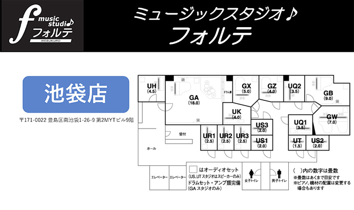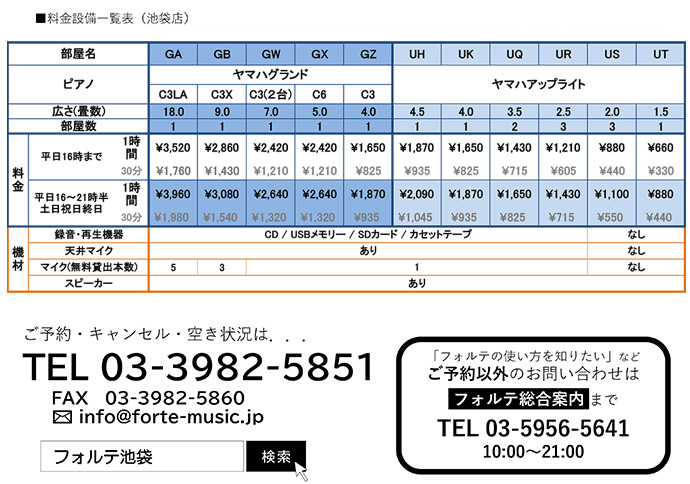 東口グリーン大通り沿いにある「ミュージックスタジオ・フォルテ池袋店」は、全室にピアノがある音楽練習スタジオです。グランドピアノがある部屋、ドラムセットがある部屋、大人数でアンサンブルができる部屋など、お客様の用途に応じた様々な部屋を多数ご用意!!キーボード、ギターアンプ、ベースアンプ、マイク、譜面台、メトロノームなどの貸出はもちろん、ギターやベースもレンタル完備していますので、雨の日やお仕事帰りなどに手ぶらでお越し下さい。クラシック、ジャズ、邦楽…ジャンルを問わずご利用頂けます。さらに鏡完備のGAスタジオはドラムセットを収納すれば広々とした空間に早変わり!!目的に応じた利用法はあなた次第…皆様のご利用をお待ちしております。 |
