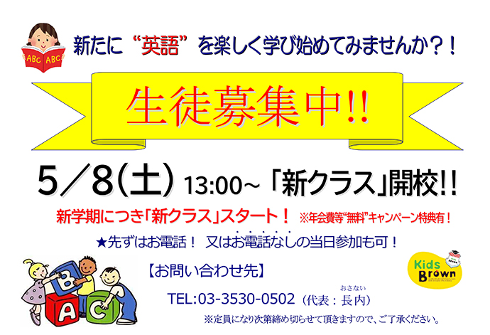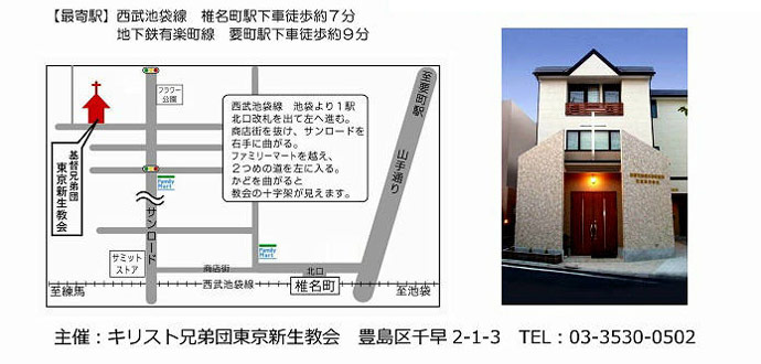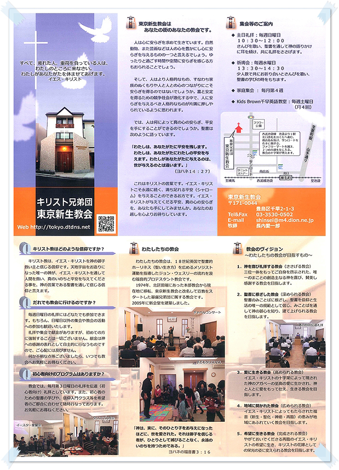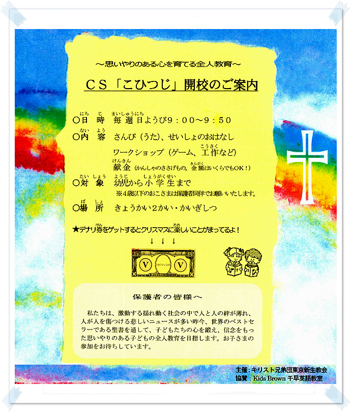豊島区千早の閑静な住宅街にある「東京新生教会」は、地域に開かれた教会として、様々な集会やイベント、 教室などを開催している”あなたの街のあなたの教会”です。 Kids Brown千早英語教室では、まず子どもたちに英語を好きになってもらい「英語を話せるようになりたい」 という動機づけをし、英語の単語だけではなくセンテンスで英語を言えるようになる事を目標に、楽しく学べ るための様々なアクティビティを取り入れ最先端のレッスンを実施。 英語の習得を通して全人的教育に貢献しつつ、子どもたちが大きな夢をもち、将来社会に貢献し、周りに幸せ をもたらす人間に育ってもらいたいと、私たちは願っています。 私たちは、地域の皆さまのお越しを、心よりお待ちしております。