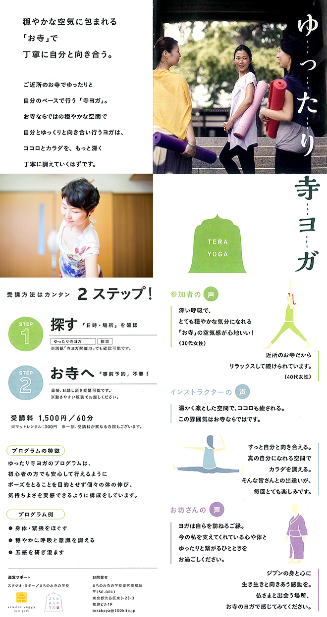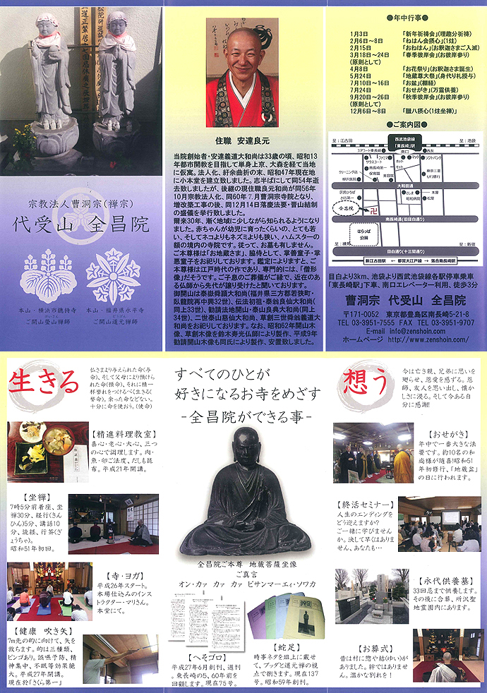 どなたでもお気軽にお越しいただける開かれたお寺、住職の顔が見えるお寺を目指し、地域の社交場、憩いの場、学びの場として、ヨガ・吹き矢・精進料理などの各種教室や、日曜朝の坐禅会など、さらには檀信徒の皆様はじめ、地域の方々、世界の平和のため