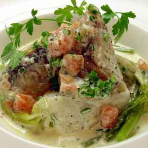 ・スズキの香草オーブン焼き…アンチョビとガーリックピューレのクリームソース