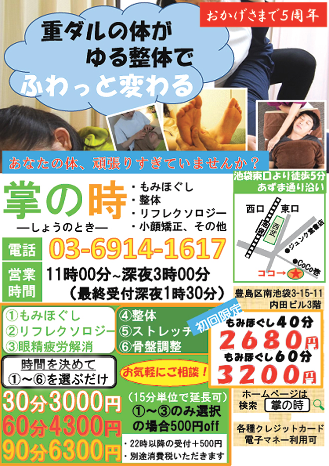 B『系列店に治療院』=池袋東口徒歩3分に系列店の治療院があります。ケガや慢性的な痛みなど、電気治療、鍼治療など、治療的な要素が必要な場合、そちらもご案内しております。