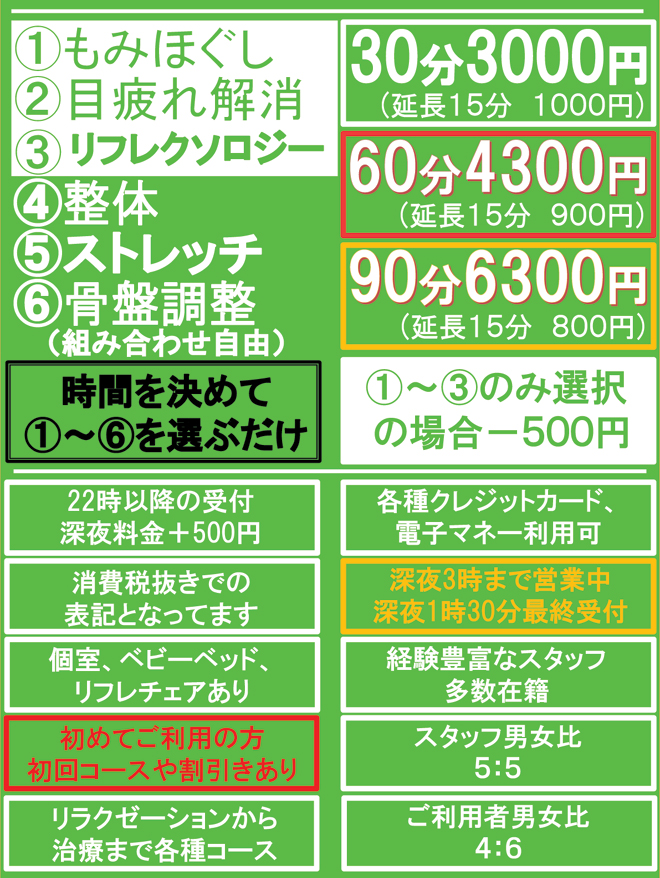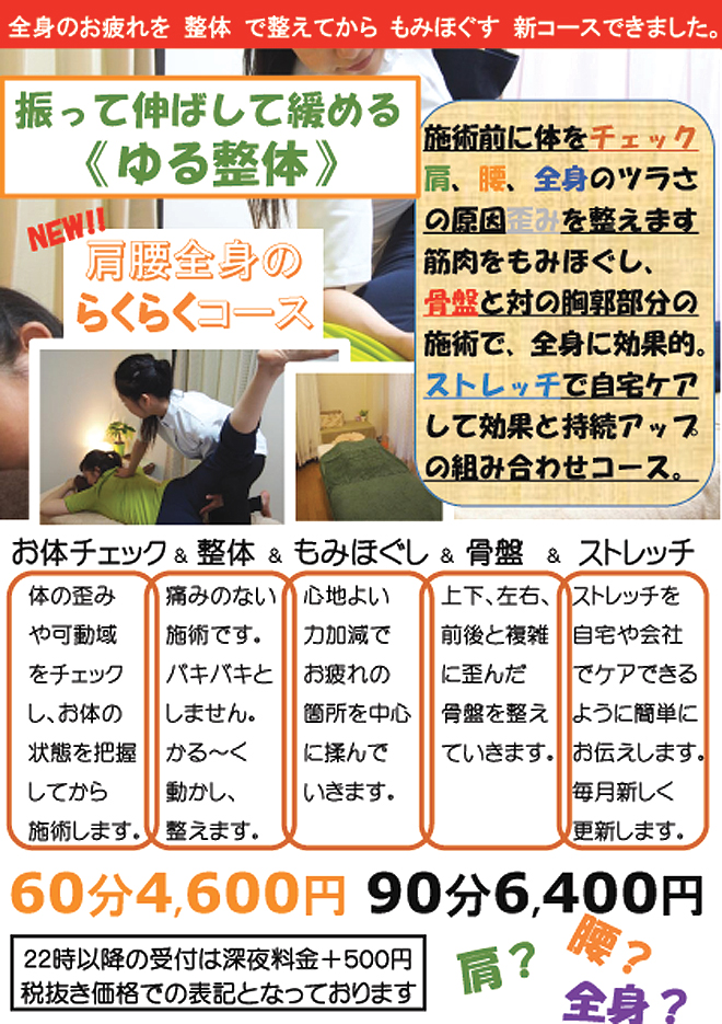 整体+もみほぐし 40分 2,980円 60分 4,000円 90分 5,500円