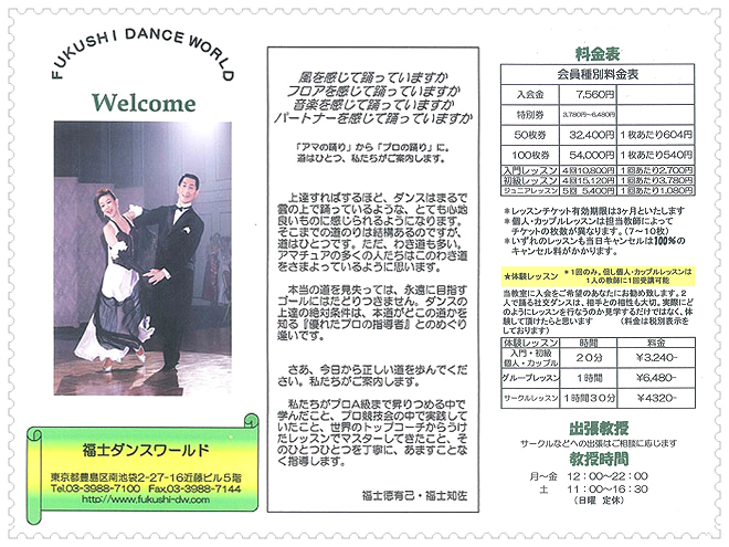 皆さんは、風を感じて、フロアーを感じて、音楽を感じて、パートナーを感じて、踊っていますか?初心者の方から上級者の方まで、私達が学んだ事、経験した事、実践している事、その1つ1つをお客様のレベルに応じて、丁寧に余す事無く指導致します。上達すればするほどダンスは、まるで雲の上で踊っているように心地よく感じられるようになります。「アマの踊り」から「プロの踊り」に、道は1つ、正しい道を歩んでください。私達がご案内致します。 |