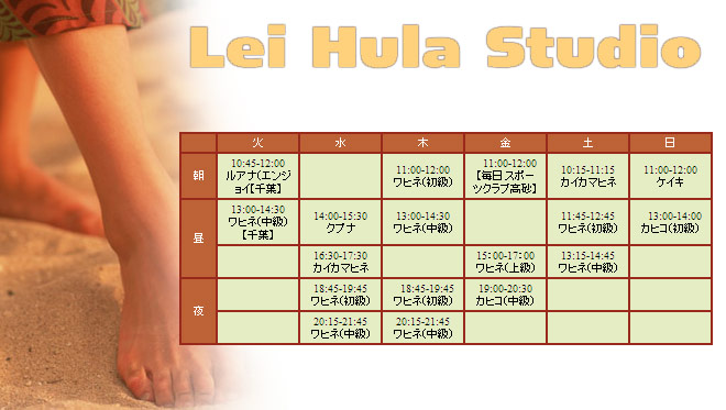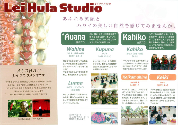 新しく誕生した東京メトロ「雑司が谷」駅すぐそば、アロハスピリッツあふれるフラダンススタジオ「Lei Hula Studio」。当スタジオでは2才〜70代の方々まで、それぞれのレベルに合わせて楽しくレッスンができます。ハワイのクム(先生)より随時アドバイスを受けながら、初めての方でも分かりやすく基本からしっかり進めていきます。また気持ち良く汗をかく事でリフレッシュし、心身のバランスも保ちます。フラダンスってどんな踊りなの?初めての方もご経験者も、フラを通じてハワイの素晴らしい文化や自然を感じながら、一緒にアロハの輪を広げてみませんか? |