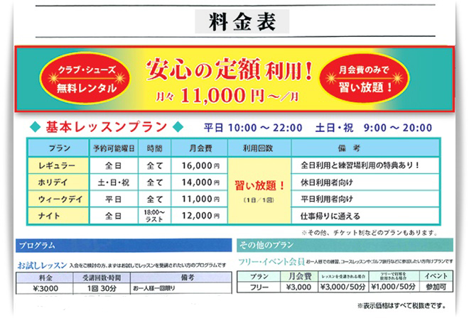 客観的に自分のクセを把握したり、飛距離計測なども確認出来ます。クラブ、シューズは無料でレンタル、電話・WEBで簡単予約の完全予約制ですので、お好きな時間に手ぶらでお気軽に、そして確実に受講が可能です。